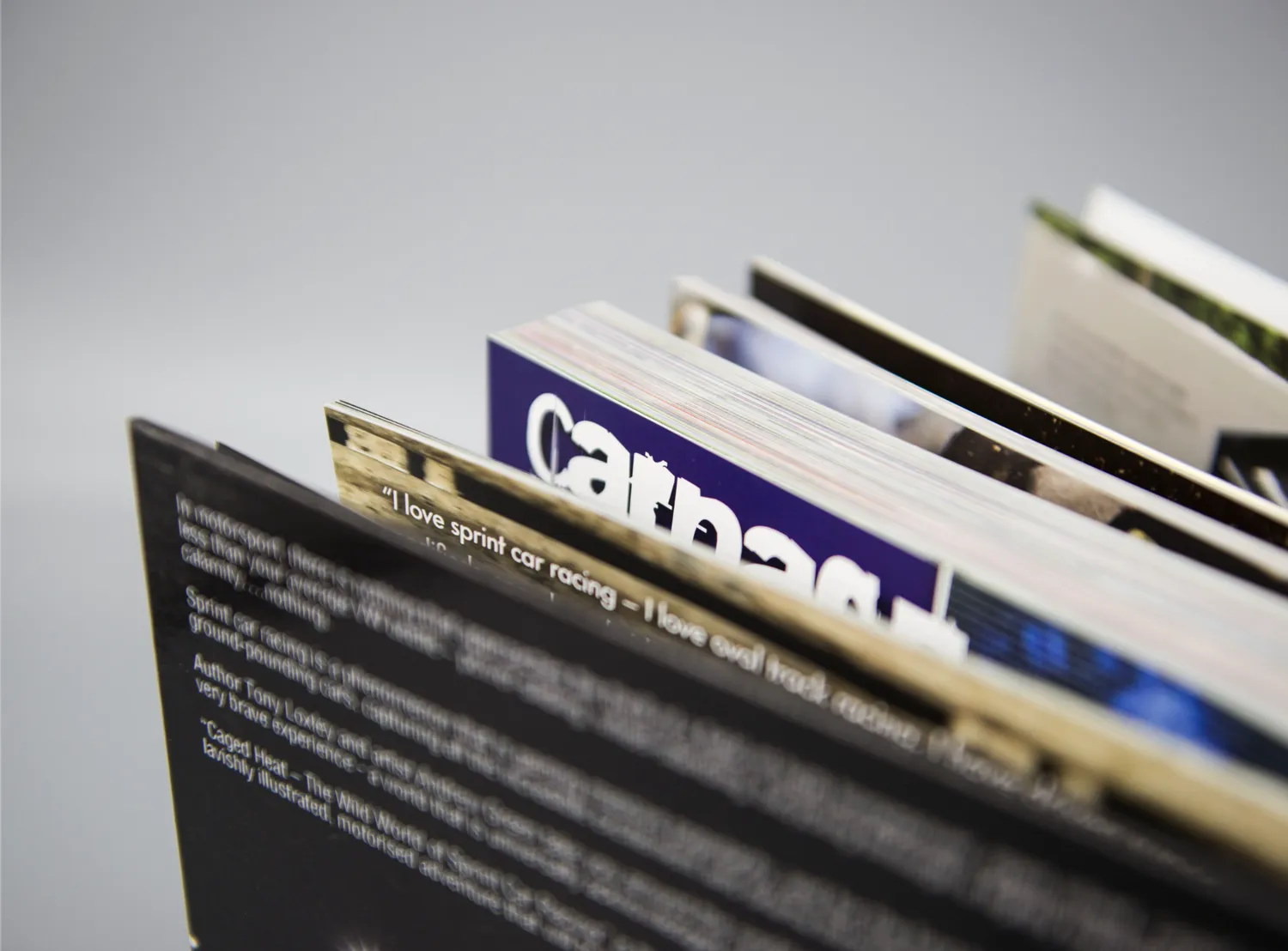 Hardcover book Cover wrapped with cloth Interior pages full color throughout with satin varnish Tight square back