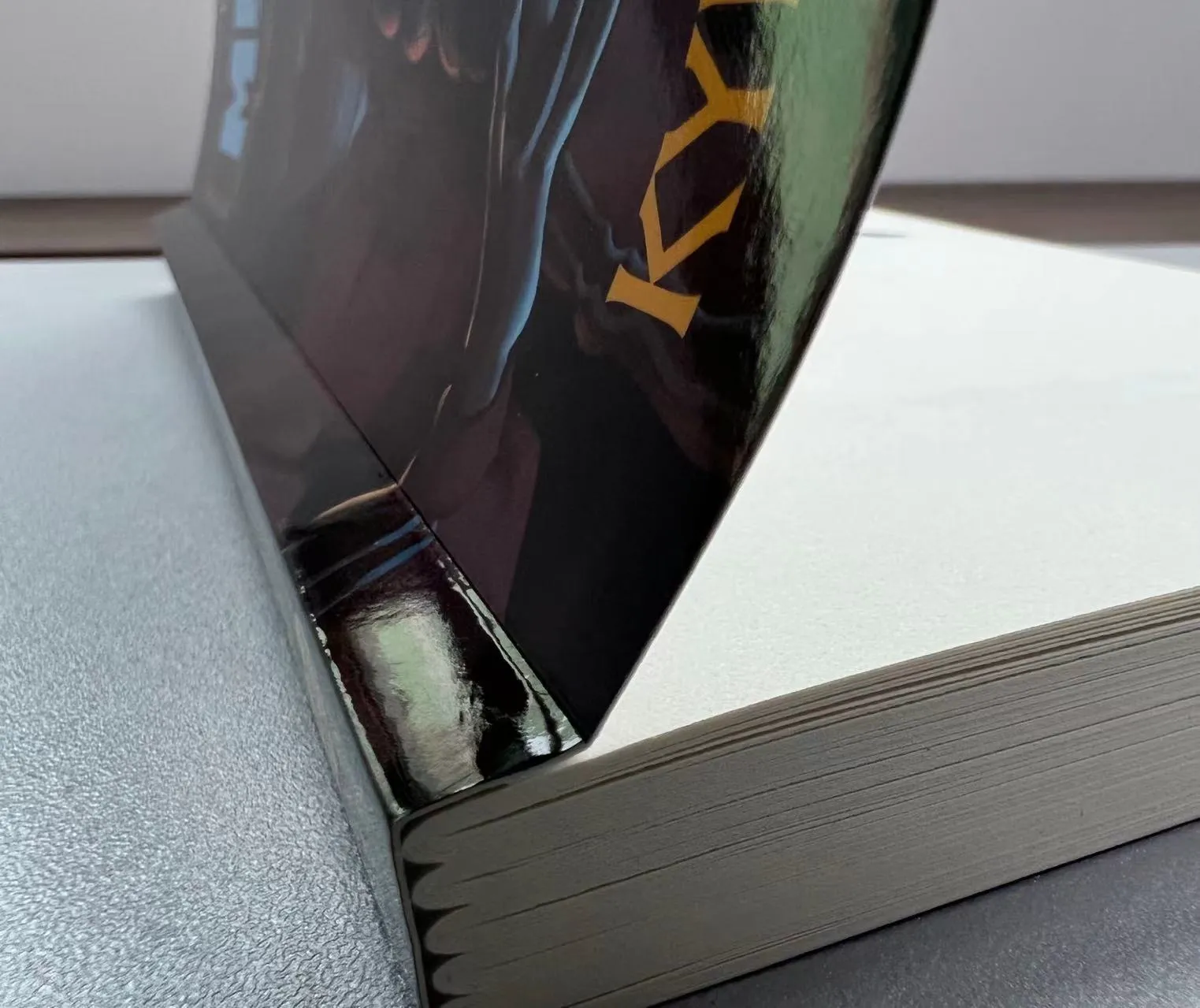 Also known as softcover binding, paperback and limp bound. The book cover is drawn on the book block with glue and usually with hinge scoring. Hinge scoring is a procedure in which extra front and back glue is applied approximately 3mm away from the spine, and a score is created on the covers at the edge of this extended glued area. This process facilitates easier book opening and reduces pressure on the spine when turning pages.