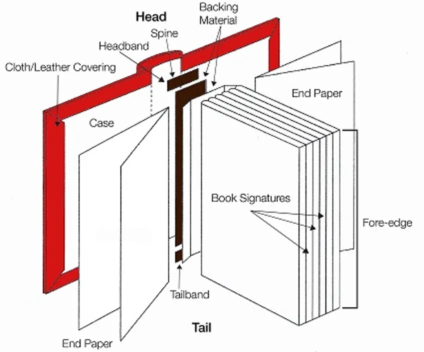 There will usually be head and tail bands (H&T bands) inserted in the spine and showed at the top and bottom of the spine in the completed book. Headbands serve a purely decorative role and do not have a functional purpose. However, they can add a vintage or design-oriented element to the final appearance of the book.