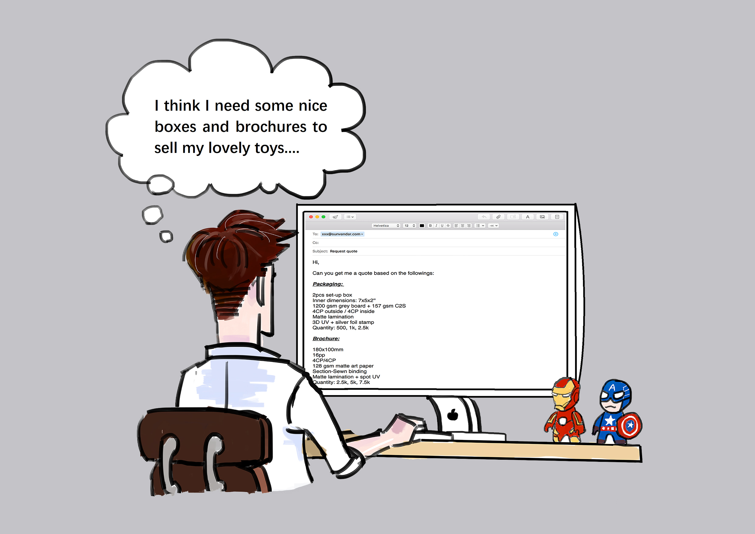 Getting a quote is fast and simple. You only need to let us know the specs of the item by describing the size, structure, material, printing, finishing and quantity. We would be able to get back to you in 24 hours.